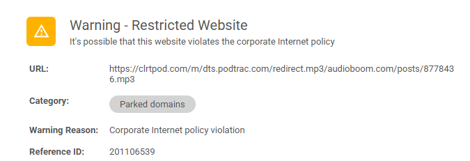 That's right - it says "Audio file unavailable" when I press Play. DevTools shows a red block entry for the domain clrtpod.com, and when I select "Open in new tab" on that one I get the below expected prompt page. That's the pain of it - the blocking of web page elements that are loaded in the background is not visible to the end user. I've suggested to Cato that they should develop a browser extension that would popup a suitable alert when this happens, but they are yet to take that idea and run with it.