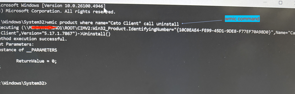 \Windows\System32\wmic product where name=“Cato Client" call uninstall